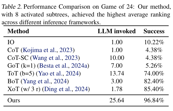 在24点游戏任务中,FoT增加树数即可提升14%准确率,明显优于ToT通过叶子节点数量扩展的方式。