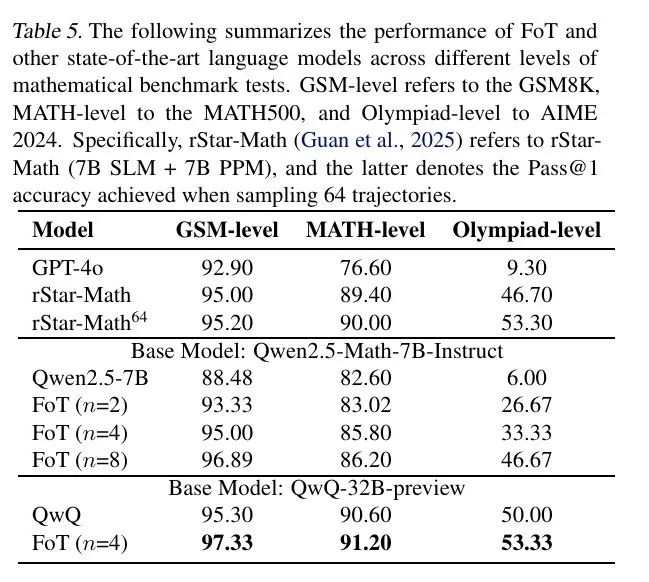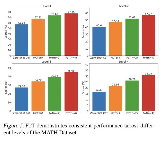 在MATH数据集全等级上,FoT推理准确率稳定提升,即使面对最复杂的问题也能保持优势。