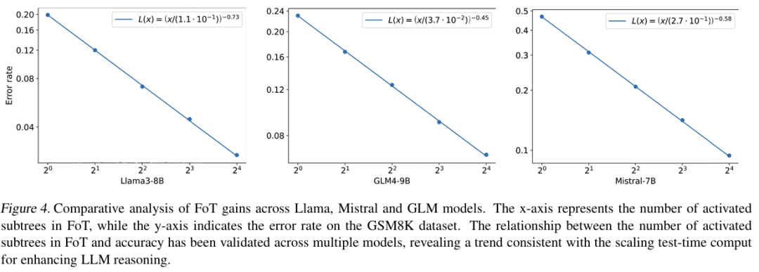 在GSM8K数学问答上,FoT与LLaMA3、Mistral、GLM等多个主流开源模型兼容,树数越多,性能提升越明显,呈现全新的推理scaling law曲线。